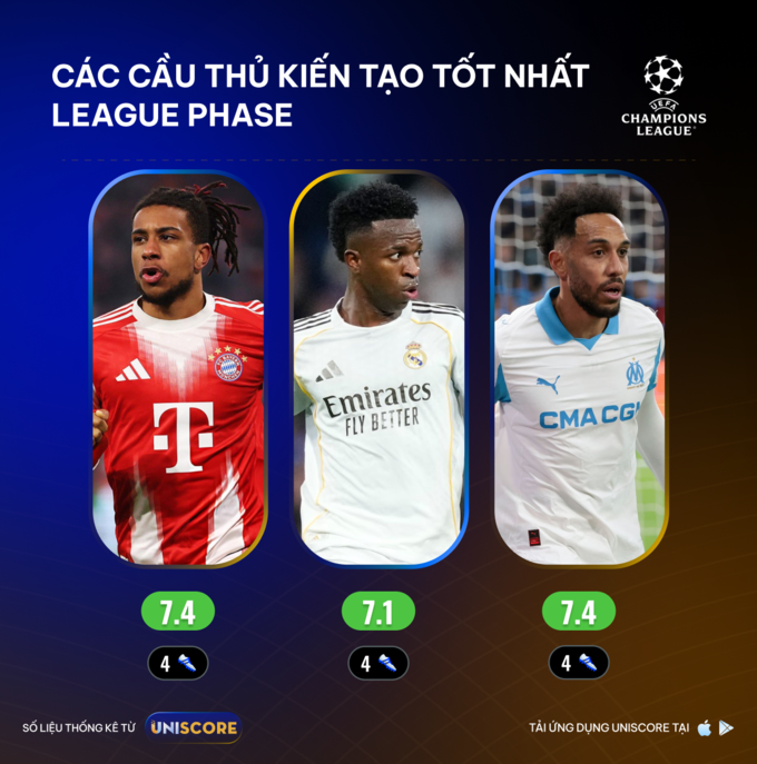 Ở hạng mục kiến tạo, giải đấu đang chứng kiến sự cạnh tranh cân bằng hơn. Ba cầu thủ đang dẫn đầu với 4 kiến tạo gồm Michael Olise (Bayern Munich), Pierre-Emerick Aubameyang (Marseille) và Vinícius Júnior (Real Madrid). Điểm đáng chú ý là Aubameyang, một cầu thủ đã bước sang sườn dốc sự nghiệp, vẫn giữ vai trò cực kỳ quan trọng trong lối chơi của Marseille.