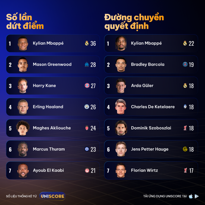 Không chỉ ghi nhiều bàn nhất, dựa trên thống kê từ Uniscore, Mbappé còn là cầu thủ dứt điểm nhiều nhất giải với 36 cú sút. Theo sau là Mason Greenwood (28 cú sút) và Harry Kane (27). Điều này phản ánh vai trò trung tâm của các tiền đạo hàng đầu trong hệ thống tấn công của các đội bóng lớn.