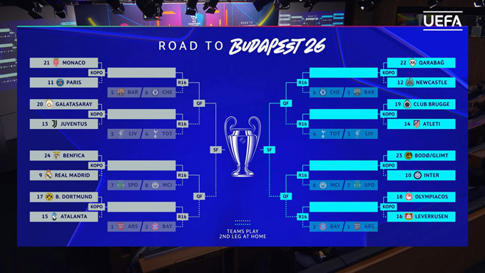 Về nhánh đấu, Real Madrid, Dortmund, Juventus và PSG sẽ nằm cùng một nhánh nếu họ vượt qua vòng play-off vào vòng 1/8. Còn ở phía đối diện, Newcastle, Atletico, Inter Milan và Leverkusen sẽ chung một nhánh nếu đi tiếp vào vòng 1/8.