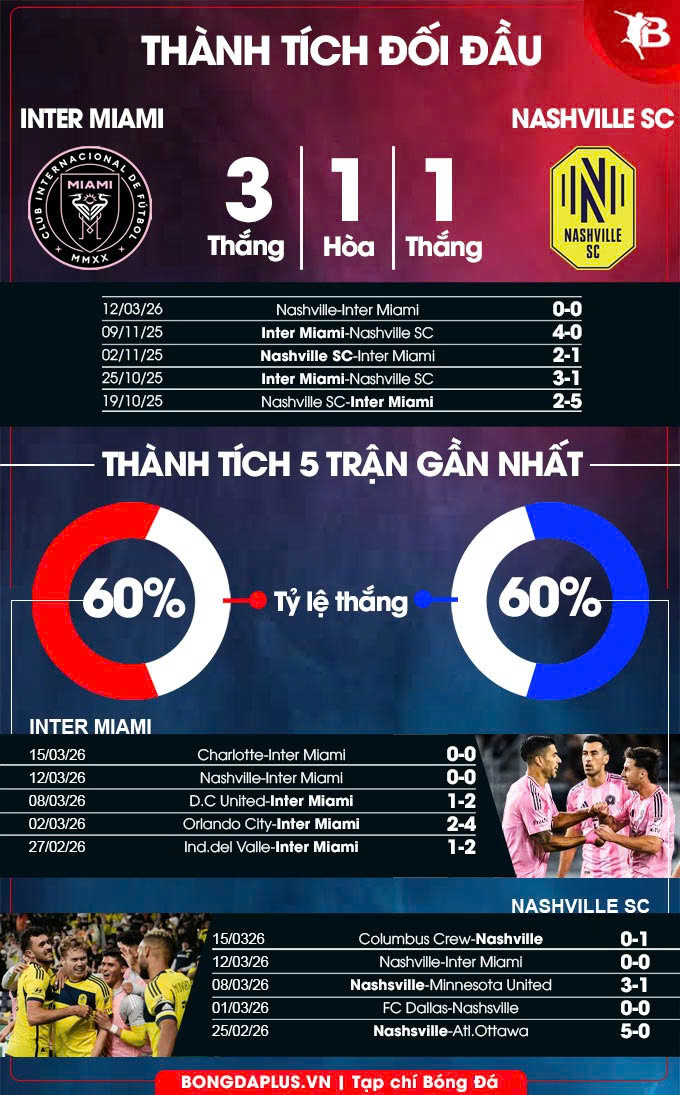 10 lần đối đầu gần nhất với Inter Miami, Nashville thua 7, thắng 1 và hòa 1. Đáng chú ý, Inter Miami toàn thắng trước Nashville trong 5 trận đối đầu gần đây trên sân nhà Chase. Do đó, khả năng cao, tấm vé đi tiếp sẽ về tay Lionel Messi và đồng đội.
