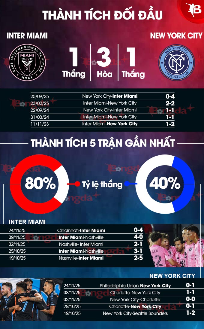 Phong độ của Inter Miami vs New York City khá cân bằng. Cụ thể, trong khi Inter Miami thắng 4/5 trận vừa xong thì New York City thắng 3/5 trận gần nhất.