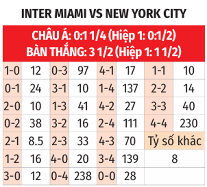 - Chẵn bàn thắng: 5/6 trận đối đầu gần nhất giữa 2 đội có tổng bàn thắng chia hết cho 2. Ngoài ra, 7/10 trận vừa qua của Inter Miami và 2/3 trận mới đây của New York City đều chứng kiến điều tương tự.