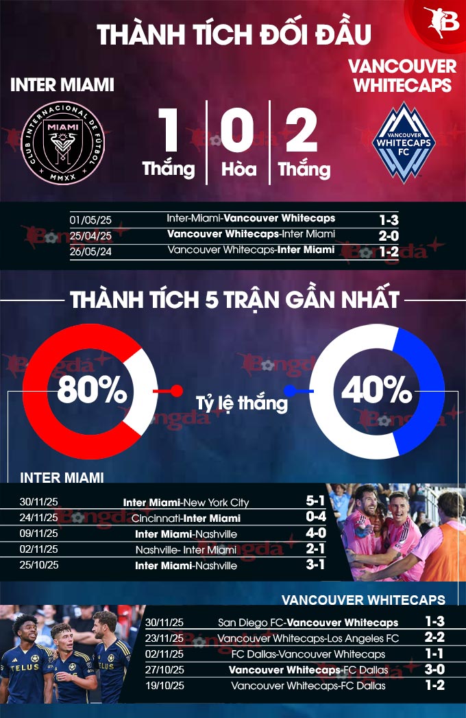 Trong khi Inter Miami thắng 7/8 trận gần nhất (chỉ tính 90 phút) thì Vancouver Whitecaps thắng 4, hòa 2 và thua 1 ở 7 trận vừa xong.