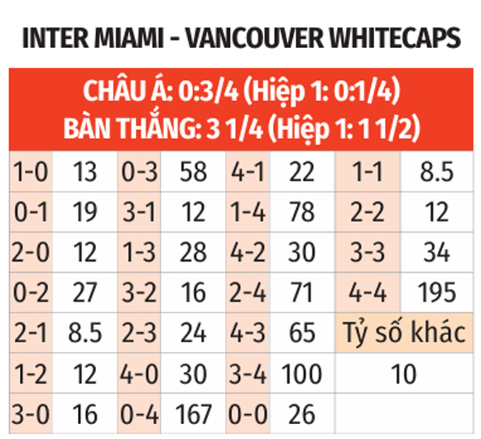 - Chẵn bàn thắng: 2/3 trận đối đầu đã qua giữa 2 đội có tổng bàn thắng chia hết cho 2. Ngoài ra, 7/10 trận vừa qua của Inter Miami và 8/12 trận mới đây của Vancouver Whitecaps đều chứng kiến điều tương tự.