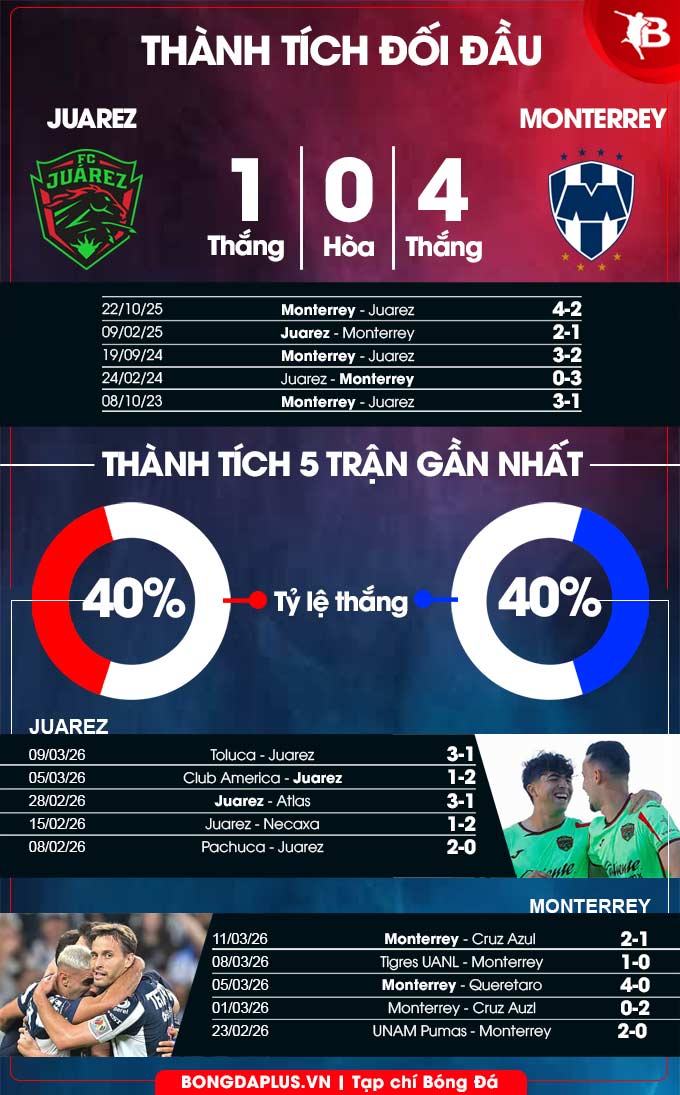 - Tỷ số chẵn: 4/6 trận gần nhất của Juarez kết thúc với tỷ số chẵn. Đây cũng là điều xảy ra ở 7/10 trận vừa qua của Monterrey.