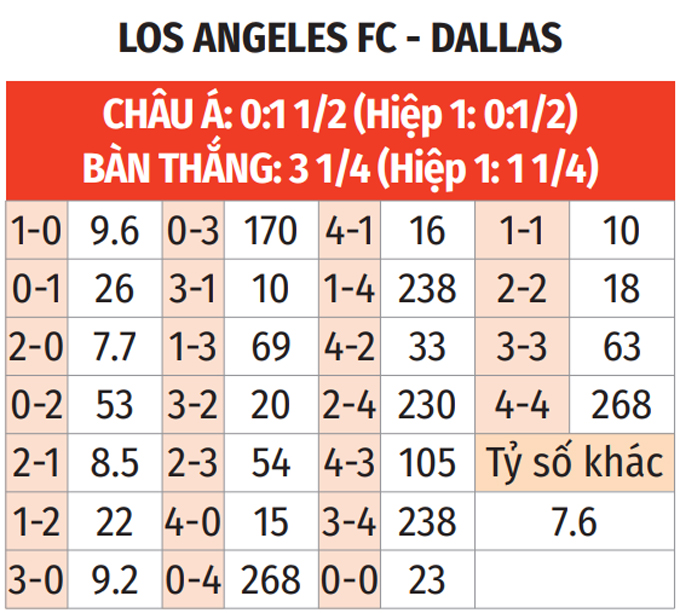 - Los Angeles FC ghi bàn hiệp 1: Los Angeles FC đã ghi ít nhất 1 bàn trong hiệp 1 ở 4/6 trận gần nhất. Đặc biệt, Los Angeles FC còn làm được điều đó trong 7/10 lần so tài gần đây với FC Dallas trên mọi đấu trường.