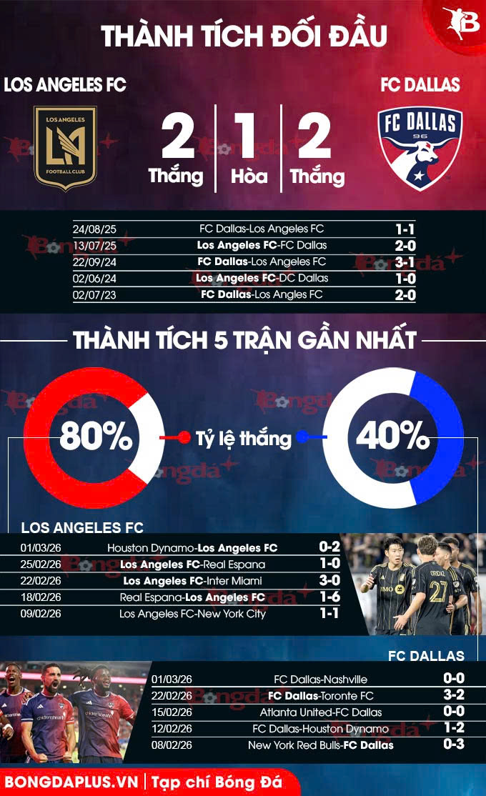 10 trận gần nhất (tính trong 90 phút), Los Angles FC bất bại còn FC Dallas thắng 5/10 trận cùng thời gian. Điều đáng lưu ý, 8 trận liên tiếp khi Los Angeles FC đón tiếp Dallas trên sân nhà, họ bất bại khi thắng 6, hòa 2.