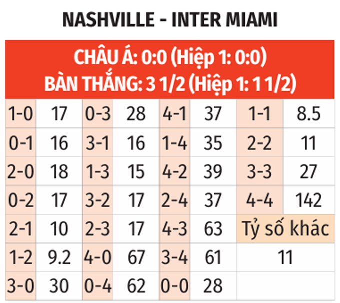 - Chẵn bàn thắng: 6/10 trận đối đầu gần nhất giữa 2 đội có tổng bàn thắng chia hết cho 2. Ngoài ra, 3/5 trận vừa qua của Nashville và Inter Miami đều chứng kiến điều tương tự.