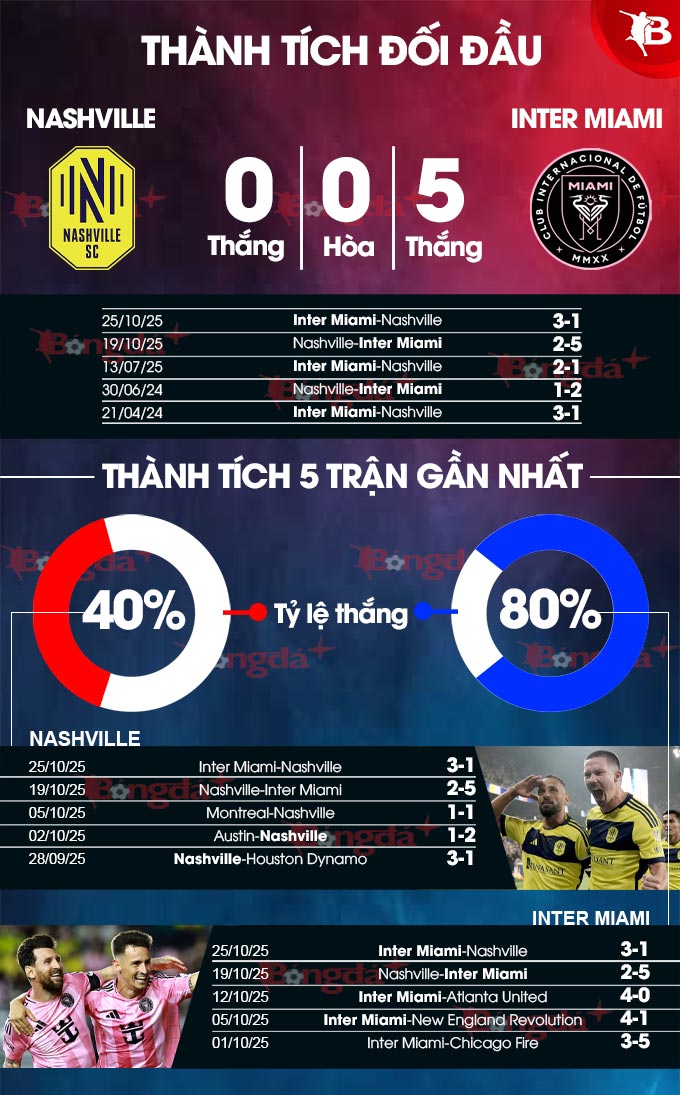 Trên sân nhà, Nashville chơi không tệ khi thắng 3/5 trận vừa qua còn Inter Miami bất bại ở sân khách trong 3 trận gần nhất. Chưa hết, Inter Miami bất bại trước Nashville ở 10 trận so tài gần đây (thắng 7, hòa 3).