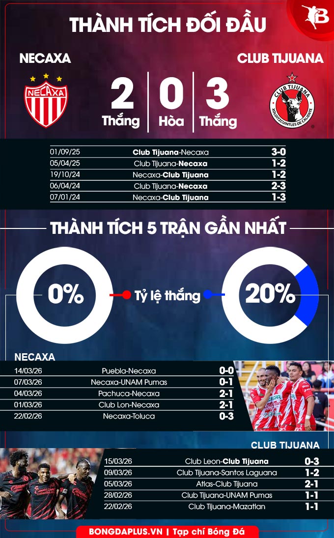Hơn nữa, 3 lần gần nhất hành quân tới sân của Necaxa, Club Tijuana không thua (thắng 1, hòa 2). Với phong độ đang tốt hơn, khả năng cao, Club Tijuana sẽ có 3 điểm tại sân Victoria.