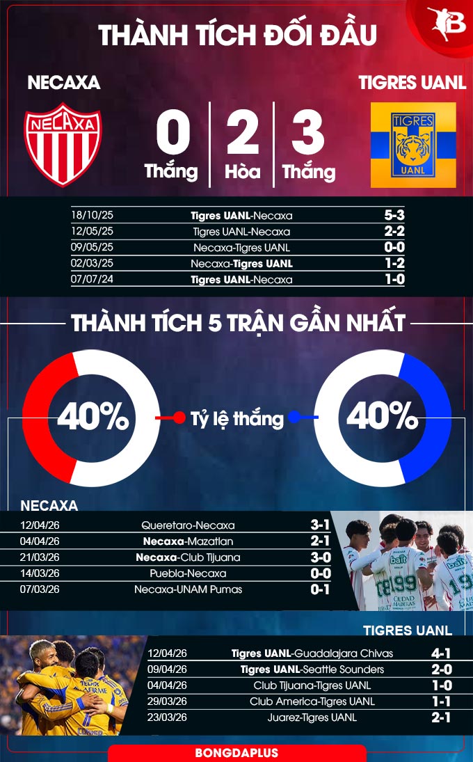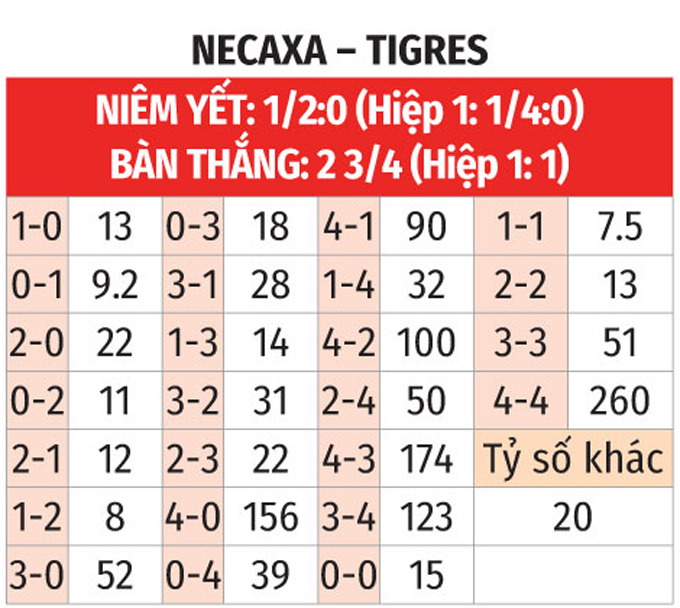 - Hiệp 1 có bàn thắng: 6/7 trận gần nhất của Necaxa và 5/8 trận gần đây của Tigres UANL đều có ít nhất 1 bàn thắng trong hiệp 1