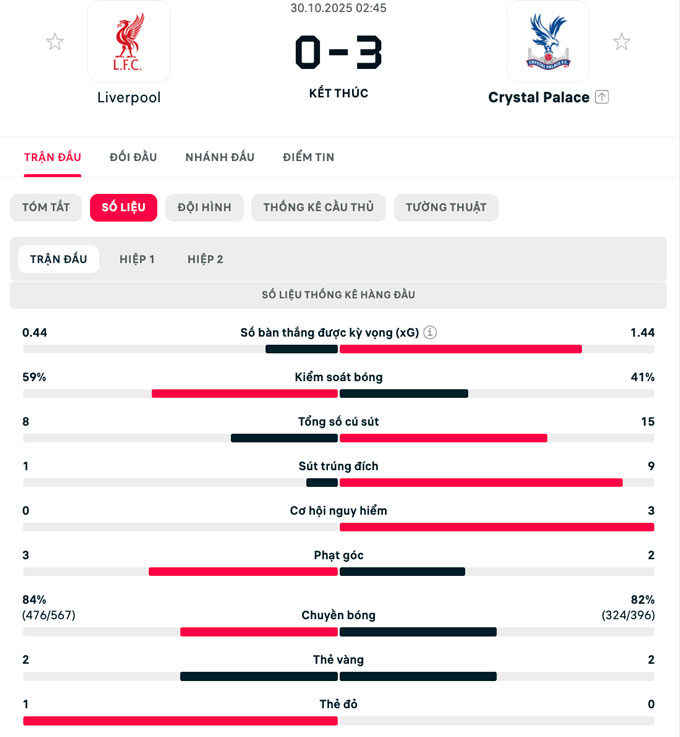 Kết quả này giúp Palace vượt qua vòng 4 League Cup trong khi Liverpool ngậm ngùi dừng bước. Ngoài ra, đây còn là chiến thắng thứ 3 liên tiếp của Đại bàng trước Liverpool ở mùa giải 2025/26.