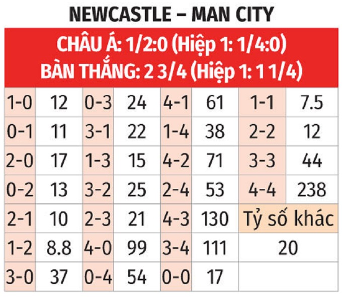 - Man City thắng châu Á hiệp 1: Đội khách nhập cuộc tốc độ, sớm thắng theo châu Á 3 trận liên tiếp gần đây trong hiệp 1. Với Newcastle, đội khách toàn thua châu Á 3 trận vừa qua trước giờ nghỉ. Newcastle thua châu Á 2/3 trận đối đầu gần nhất trong hiệp đầu.