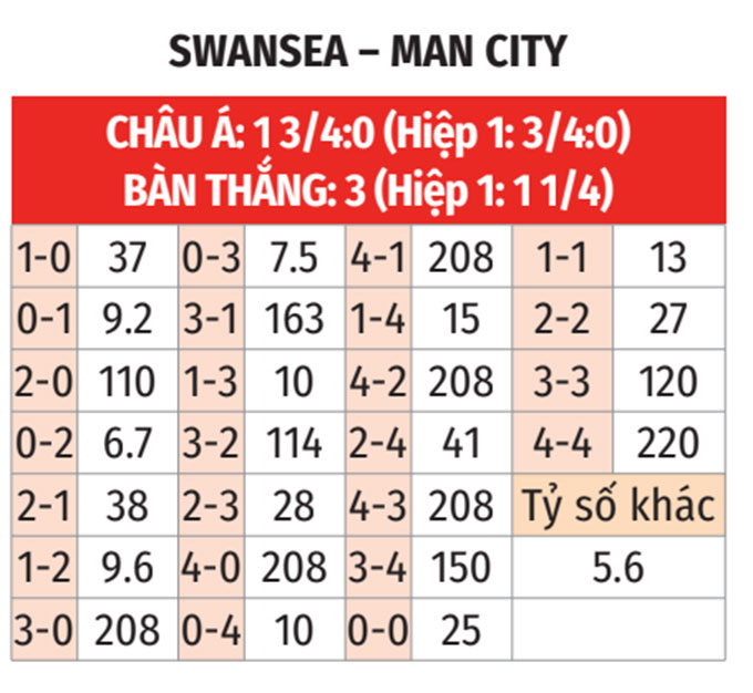 - Tỷ số chẵn: 3/4 trận Swansea City tiếp đón Man City gần đây có tỷ số chẵn. 7/9 trận vừa qua của Man City cũng có số bàn thắng chia hết được cho 2.