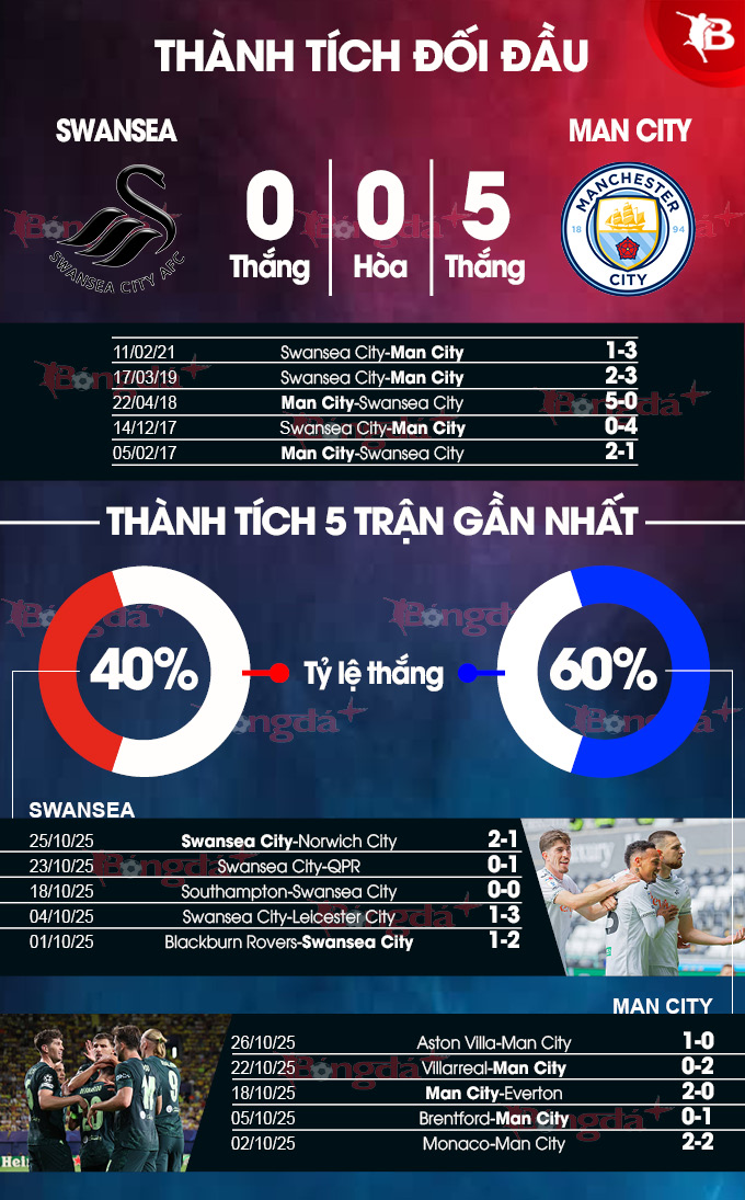 Giành tới 26 chiến thắng trong 37 lần đụng độ Swansea City trước đây, Man City chắc chắn là đối thủ mà bầy Thiên nga rất e ngại. Với đẳng cấp và phong độ hơn hẳn đối phương, khả năng cao Man City sẽ một lần nữa thu về kết quả có lợi.