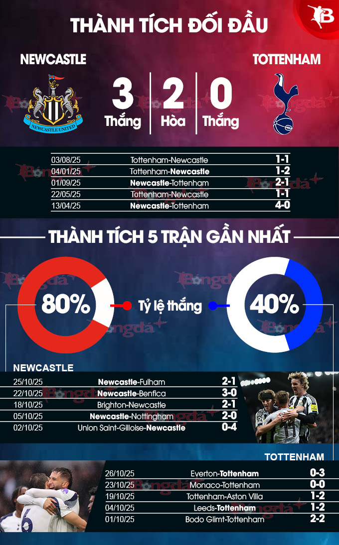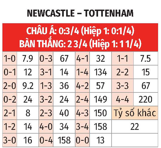 - Lẻ bàn thắng: 2/3 trận đối đầu gần nhất giữa 2 đội có tổng bàn thắng không chia hết cho 2. Ngoài ra, 3 trận vừa qua của Newcastle và 3/4 trận mới đây của Tottenham chứng kiến điều tương tự.