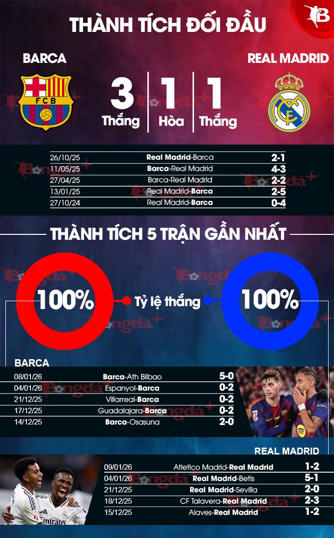 Cách đây một năm, Barca cũng từng đánh bại Real Madrid với tỷ số 5-2 để lên ngôi, và nhà vô địch La Liga sẽ bước vào trận đấu này với chuỗi 9 trận thắng liên tiếp trên mọi đấu trường. Đội bóng của Flick thực tế chưa thua trận nào ở giải quốc nội kể từ thất bại 2-1 trước chính Real Madrid tại La Liga hồi cuối tháng 10/2025 và hai gã khổng lồ của bóng đá Tây Ban Nha đang chuẩn bị đối đầu lần thứ 263 trong lịch sử.