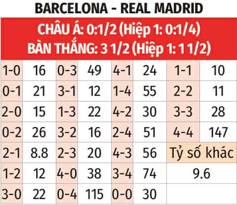 • Real Madrid thắng châu Á hiệp 1: Barca thua châu Á 4/6 trận gần đây trong hiệp đầu. Với Real Madrid, đội bóng Hoàng gia toàn thắng châu Á 5 trận liên tiếp gần đây trước giờ nghỉ. Real Madrid cũng thắng châu Á hiệp đầu trận đối đầu ở La Liga đầu mùa giải này.