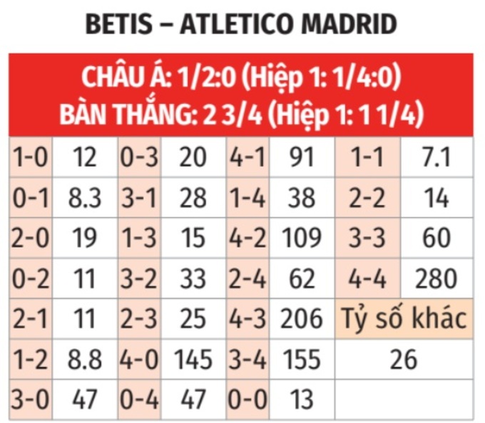 - Tối thiểu 2 bàn hiệp 1: 3/4 lần gặp giữa 2 đội gần đây đều có từ 2 bàn thắng trở lên trong hiệp 1. Tình trạng tương tự xảy ra ở 2 trận gần đây của Betis và cả 2 trận vừa qua của Atletico tại các giải đấu Cúp.
