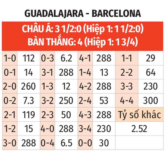 • Tối thiểu 2 bàn ở hiệp 1: 3/5 trận gần nhất của Guadalajara đều có từ 2 bàn thắng trở lên trong hiệp 1. Chưa hết, 5/8 trận vừa qua của Barca cũng có kịch bản tương tự.