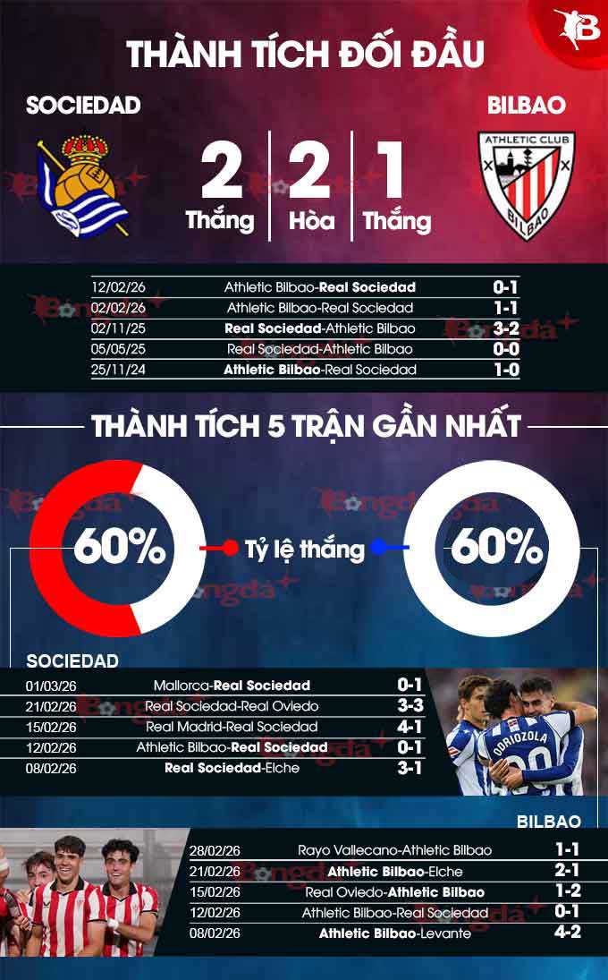 - Trên 2 bàn: 4/6 trận vừa qua của Sociedad đều có trên 2 bàn. 4/6 trận gần đây của Bilbao cũng diễn ra theo kịch bản tương tự.