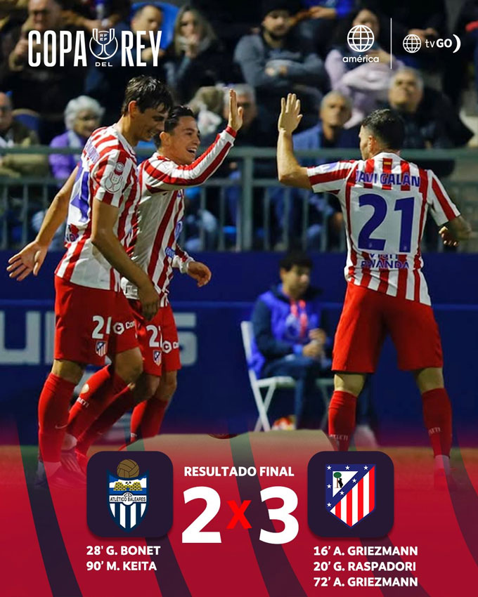 Griezmann và Raspadori sớm đưa Atletico dẫn 2-0 chỉ sau 20 phút thi đấu. Tới phút 28, Baleares gỡ lại 1 bàn nhờ công của Bonet. Tới phút 72, Griezmann ghi thêm bàn nữa cho Atletico và tưởng như Rojiblancos sẽ có được chiến thắng dễ dàng.