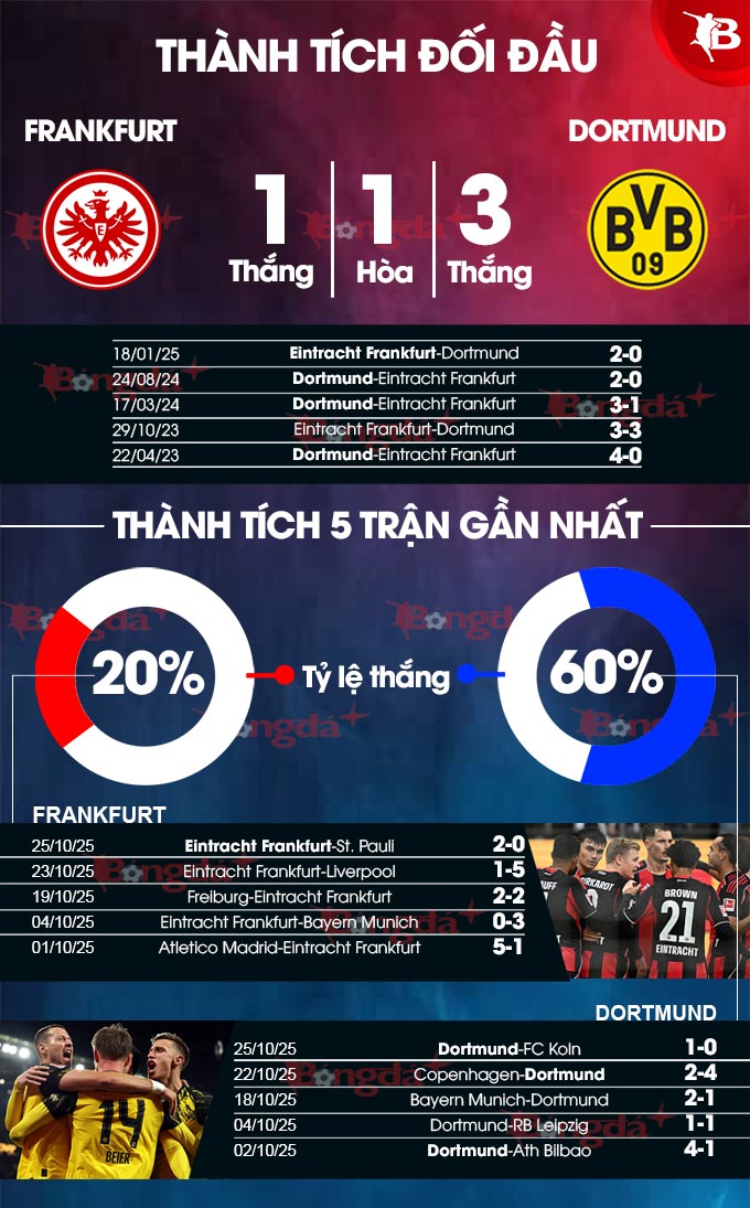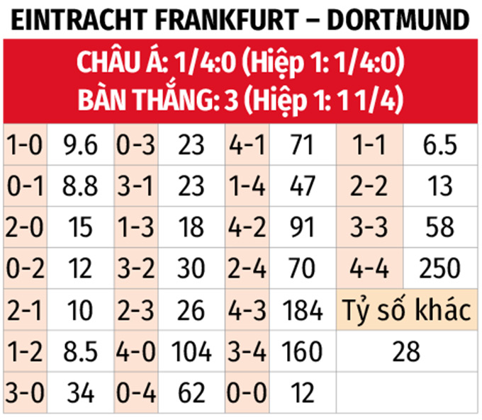 - Dortmund thắng châu Á hiệp 1: Các cầu thủ Eintracht Frankfurt nhập cuộc khá chậm ở những trận sân nhà, khi để thua 3/4 trận gần đây trong hiệp 1. Thành tích này trái ngược Dortmund, đội thắng 6/10 trận sân khách vừa qua trước giờ nghỉ. Chính vì thế, dù lịch sử chứng kiến Eintracht Frankfurt lấn lướt Dortmund trong hiệp đầu, nhưng kịch bản này khó có thể tái diễn ở màn so tài giữa tuần này.
