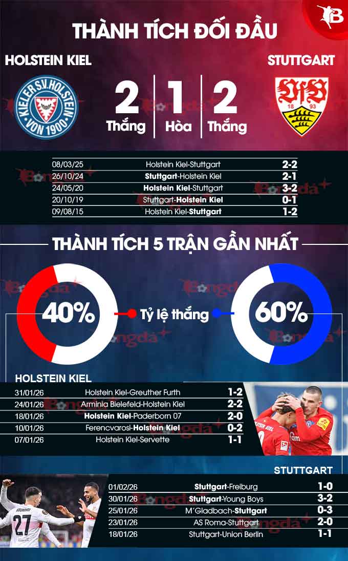 - Lưới rung cuối trận: 4/6 trận vừa qua của Holstein Kiel đều có đội thủng lưới trong 13 phút cuối. 5/6 trận gần nhất của Stuttgart bảng tỷ số vẫn còn cập nhật sau phút 80.