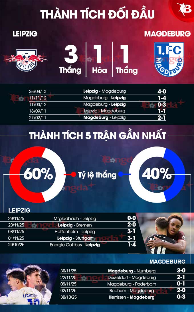 - Cả hai đội cùng ghi bàn: 4/6 cuộc đối đầu gần nhất, 8/10 trận sân nhà vừa qua của Leipzig đều khép lại với ít nhất 1 bàn thắng cho mỗi đội. Còn Magdeburg đều ghi bàn ở 4/6 trận gần đây. Xem ra, kịch bản tương tự nhiều khả năng cũng xảy ra ở trận này.