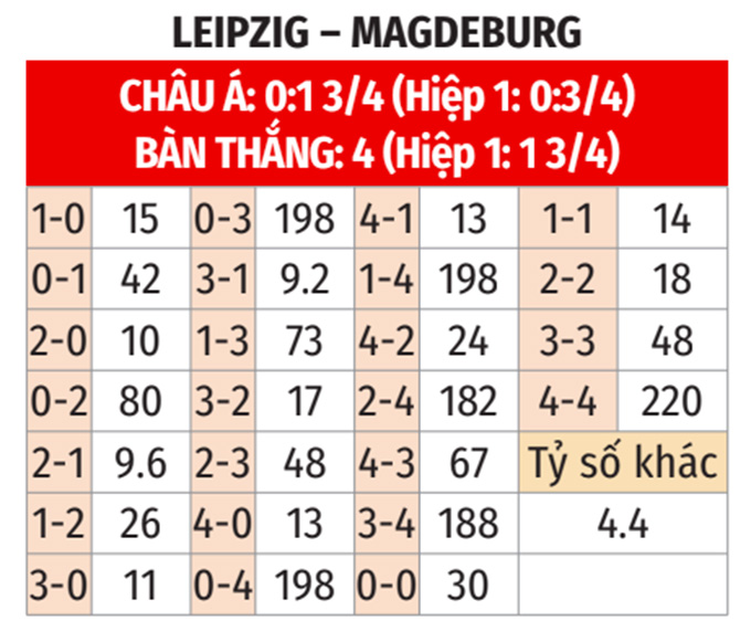 - Chẵn bàn thắng: 6/8 trận gần nhất của Leipzig và 5/8 chuyến làm khách vừa qua của Magdeburg cũng khép lại với tổng bàn thắng là chẵn. Hơn nữa, 8/11 trận sân nhà vừa qua của Leipzig cũng đều khép lại với tổng bàn thắng chia hết cho 2. Trận này khó có ngoại lệ.