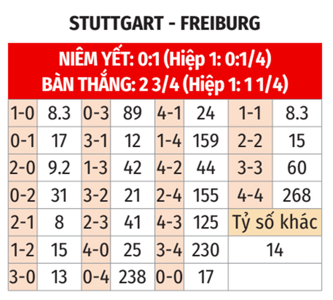 - Stuttgart ghi bàn hiệp 1: Stuttgart ghi ít nhất 1 bàn trong hiệp 1 ở 6/7 trận đối đầu gần đây, ở 5/7 trận gần nhất đón tiếp Freiburg trên sân nhà. Ngoài ra, Stuttgart cũng làm được điều tương tự ở 3/4 trận vừa qua.