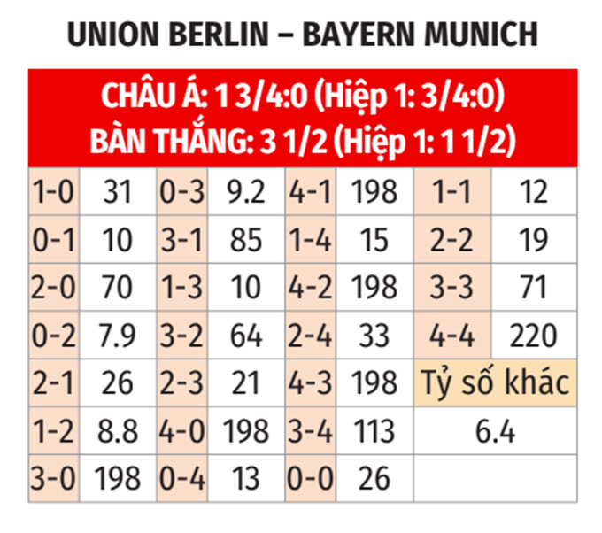 - Chẵn bàn thắng: 5/8 cuộc đối đầu gần nhất, 6/9 trận gần đây của Union Berlin (trừ giao hữu) và cả 4 trận vừa qua của Bayern Munich đều có tổng bàn thắng là chẵn. Hơn nữa, 7/8 cuộc đụng độ gần nhất tại sân nhà của Union Berlin, 6/7 trận chính thức vừa qua của Union Berlin cũng đều có tổng bàn thắng chia hết cho 2.