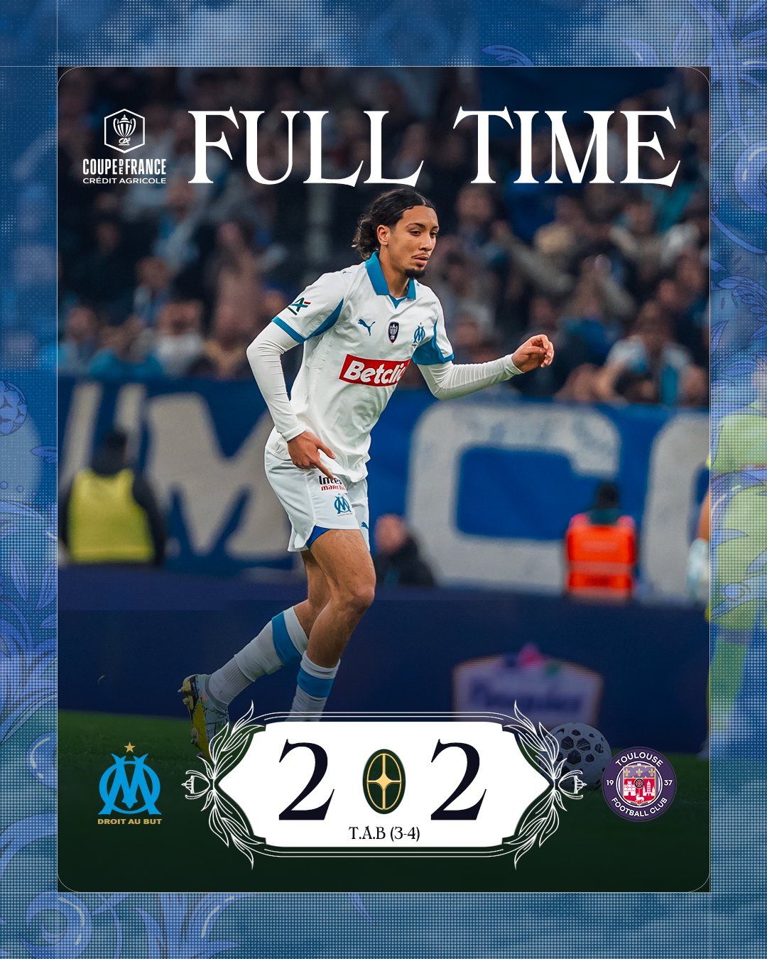Bước vào loạt sút luân lưu, trong khi Toulouse chỉ có 1 trường hợp đá hỏng thì Marseille lại có 2, bao gồm cả Nwaneri - tài năng trẻ của Arsenal được CLB miền Nam nước Pháp mượn. Thua 3-4 sau loạt cân não, Marseille chia tay cúp Quốc gia Pháp trong nghẹn ngào.