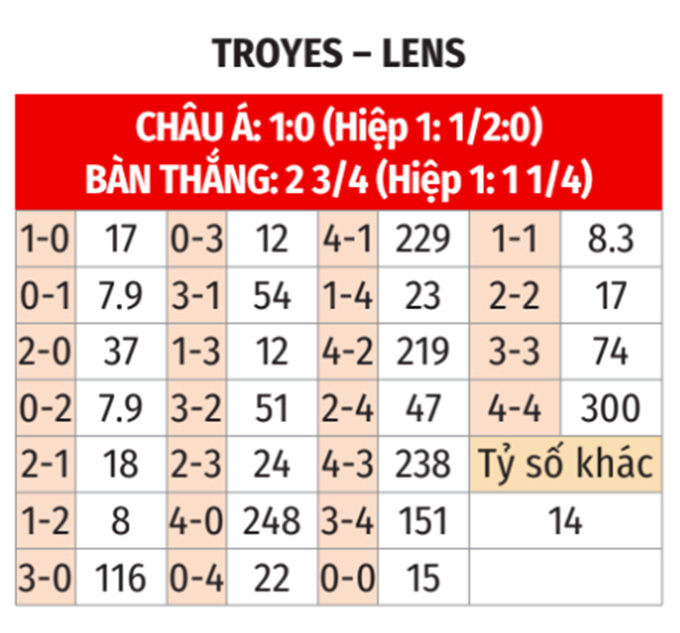 - Lens thắng theo châu Á: Lens thắng 4, hòa 1, thua 1 ở 6 chuyến làm khách gần nhất tại Troyes, thắng 8/12 trận gần đây, thắng 5/6 chuyến làm khách vừa qua. Còn Troyes thua cả 2 trận gần nhất. Xem ra, giới mộ điệu có thể tin tưởng vào Lens ở trận này.