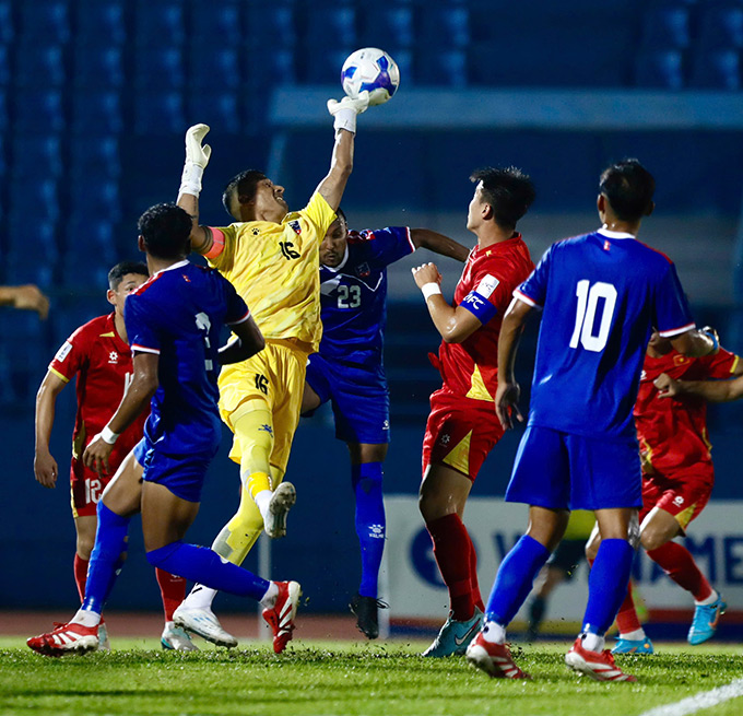 Không vào!!! Hai Long sút phạt tầm thấp. Bóng qua nách hàng rào hướng về góc xa. Thủ môn Nepal đã cản phá xuất sắc. Ảnh: Anh Khoa