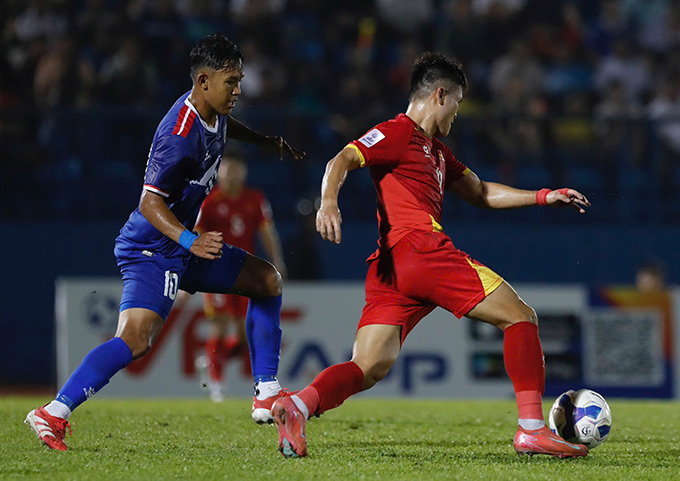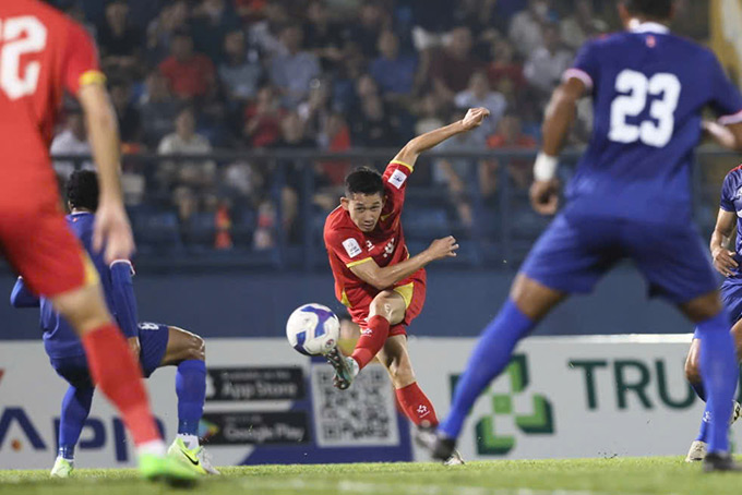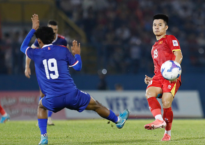 Không vào! Tình huống dứt điểm đáng chú ý của ĐT Việt Nam. Hai Long đi bóng và tung ra cú dứt điểm căng, bóng đi vọt xà ngang khung thành Nepal. Ảnh: Anh Khoa