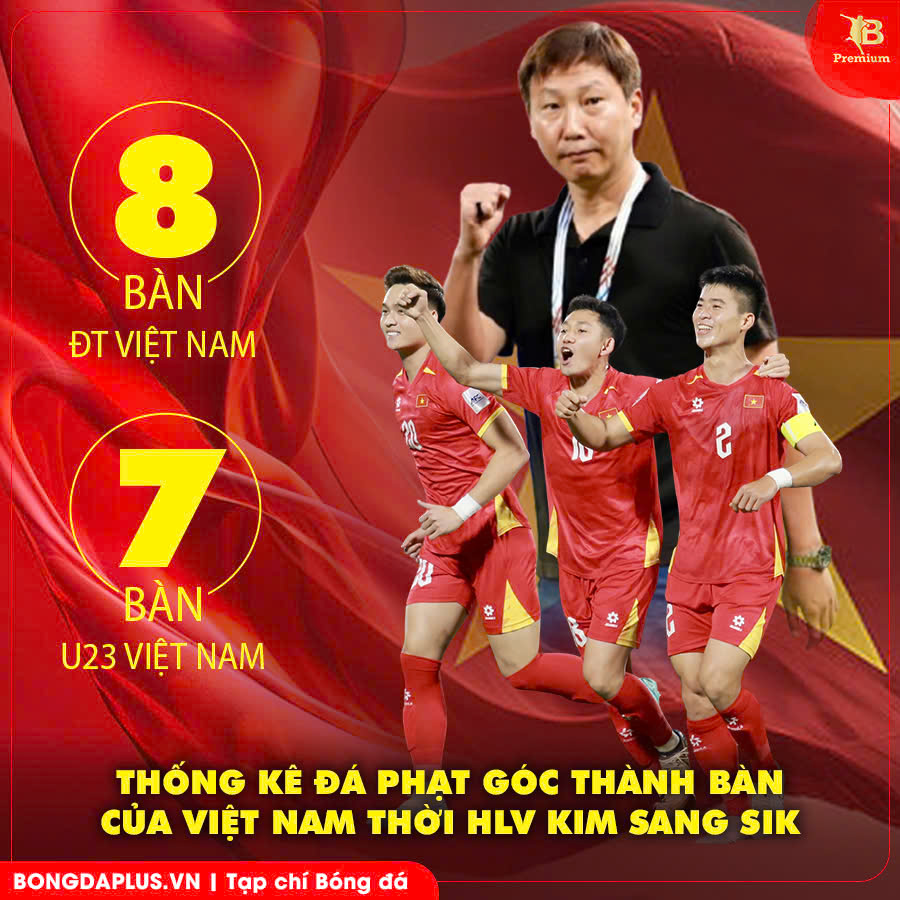 Thống kê đá phạt góc thành bàn của Việt Nam thời HLV Kim Sang Sik ĐT Việt Nam: 8 bàn/ 21 trận U23 Việt Nam: 7 bàn/ 17 trận ĐT Việt Nam 1. Việt Nam 4-1 Lào (9/12/24) - Quang Hải đá phạt góc, Văn Vĩ ghi bàn 2. Việt Nam 1-1 Philippines (18/12/24): Hoàng Đức đá phạt góc, Ngọc Tân ghi bàn 3. Singapore 0-1 Việt Nam (26/12/24): Hoàng Đức đá phạt góc, Xuân Son ghi bàn 4. Việt Nam 5-0 Lào (25/3/2025): Minh Khoa đá phạt góc, Văn Vĩ ghi bàn 5. Việt Nam 3-1 Nepal (9/10/2025): Tiến Anh đá phạt góc, Xuân Mạnh ghi bàn 6. Việt Nam 1-0 Nepal (14/10/2025): Tiến Anh đá phạt góc, Shrestha đá phản lưới nhà 7. Việt Nam 3-0 Bangladesh (26/3/2026): Tiến Anh đá phạt góc, Tuấn Hải ghi bàn 8. Việt Nam 1-0 Malaysia (31/3/2026): Tiến Anh đá phạt góc, Duy Mạnh ghi bàn U23 Việt Nam: 7 bàn 1. U23 Việt Nam 3-0 U23 Lào: Hiểu Minh ghi bàn 2. U23 Việt Nam 2-1 U23 Campuchia: Lý Đức 3. U23 Việt Nam 1-0 U23 Indonesia: Công Phương 4. U23 Việt Nam 2-0 U23 Bangladesh: Viktor Lê 5. U23 Việt Nam 2-0 U23 Malaysia: Hiểu Minh 6. U23 Việt Nam 3-2 U23 Thái Lan: Waris phản lưới nhà 7. U23 Việt Nam 2-0 U23 Jordan: Đình Bắc |
