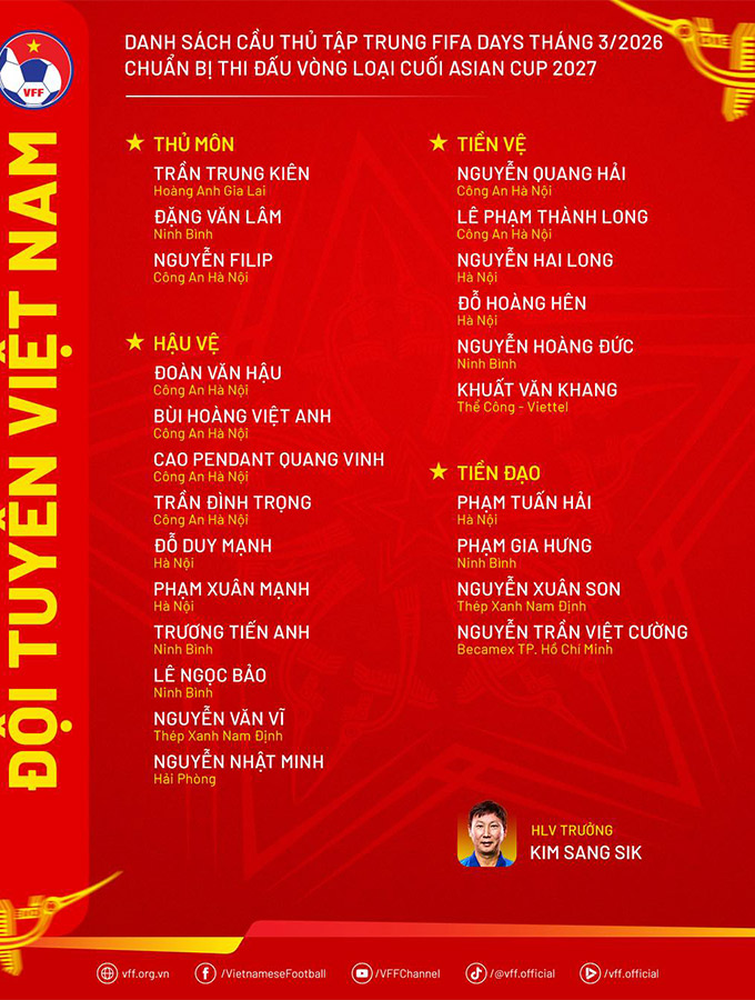Thủ môn: Trần Trung Kiên, Nguyễn Filip, Đặng Văn Lâm