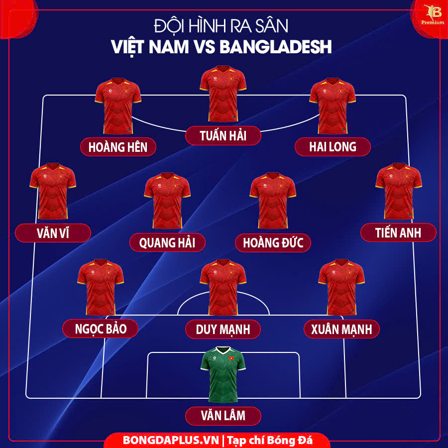 HLV Kim Sang Sik ưu tiên những nhân tố lên tập trung từ đầu cùng ĐT Việt Nam. Có thể thấy bộ ba tấn công là những cái tên của CLB Hà Nội như Hai Long, Hoàng Hên, Tuấn Hải. Sự hiểu nhau đến từ bộ ba này tại đội bóng thủ đô hứa hẹn mang đến cho ĐT Việt Nam những tình huống tấn công đáng chú ý trước Bangladesh. Ở phía dưới, những cầu thủ thuộc biên chế CLB Hà Nội như Duy Mạnh, Xuân Mạnh cũng hiện diện. Người hâm mộ cũng chú ý đến Quang Hải và Hoàng Đức trong vai trò tiền vệ trung tâm.