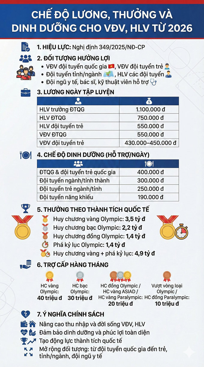 Từ ngày 15/2/2026, chính sách mới của Chính phủ sẽ áp dụng chế độ lương, thưởng và đãi ngộ toàn diện cho các huấn luyện viên, vận động viên và đội ngũ y tế trong thể thao. Chính sách mới không chỉ áp dụng cho ĐTQG, mà còn mở rộng đến đội tuyển trẻ, đội tuyển tỉnh/ngành và toàn bộ đội ngũ y tế hỗ trợ.