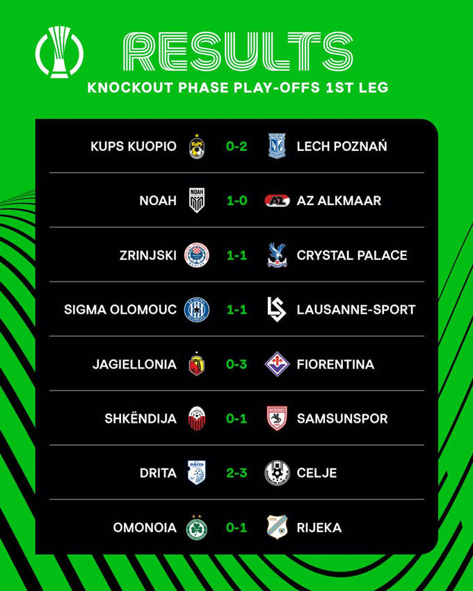 Trong khi đó, FC Noah thắng AZ Alkmaar 1-0, Lech Poznan thắng KuPS 2-0, NK Celje vượt qua Drita với tỷ số 3-2, Shkendija thua Samsunspor 0-1 ngay trên sân nhà còn Rijeka cũng có chiến thắng tối thiểu 1-0 ngay trên sân của Omonia.