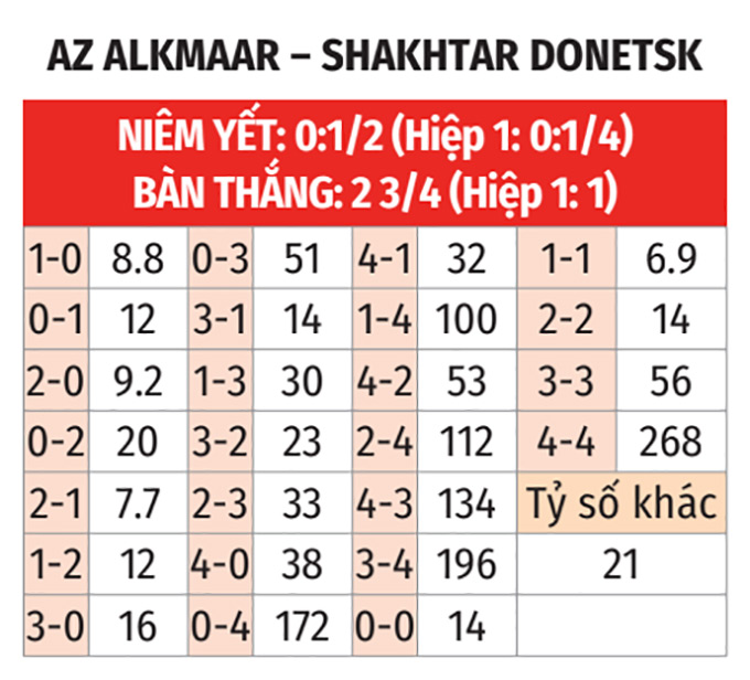 - Tỷ số lẻ: 4/5 trận vừa qua của Shakhtar Donetsk kết thúc với tỷ số lẻ. 3/4 trận gần đây của AZ cũng diễn ra theo kịch bản này.