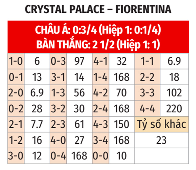 - Hiệp 1 không có bàn nào: 2/3 trận gần nhất của Crystal Palace và 4/6 trận vừa qua của Fiorentina đều không có bàn thắng nào được ghi trong hiệp 1. Hơn nữa, 3/4 trận sân nhà vừa qua của Crystal Palace cũng khép lại hiệp 1 mà không có bàn thắng nào.
