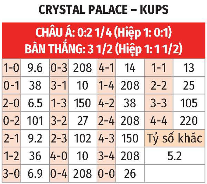 Phong độ của Crystal Palace vs KuPS đang hoàn toàn khác biệt. Trong khi Palace thắng 3/4 trận gần nhất thì KuPS không thắng ở cùng thời gian. Crystal Palace có lợi thế sân nhà và được đánh giá cao hơn nhiều so với KuPS. Do đó, Palace với đẳng cấp hiện tại nhiều khả năng sẽ có 3 điểm trước đội khách.