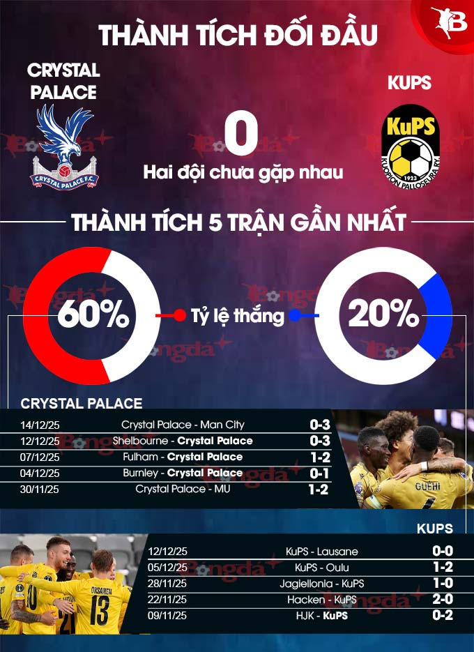 - Hai đội cùng ghi bàn: Crystal Palace thành công trong việc ghi bàn ở 4/5 trận gần nhất còn với KuPS là ở 6/9 trận vừa xong. Bên cạnh đó, Palace cũng ghi bàn ở 6/9 trận chính thức gần nhất trên sân nhà, còn KuPS làm được điều đó ở 5/8 trận gần nhất trên sân khách. Với xu hướng như vậy, khả năng cao hai đội sẽ cùng tìm được đường vào khung thành của nhau.