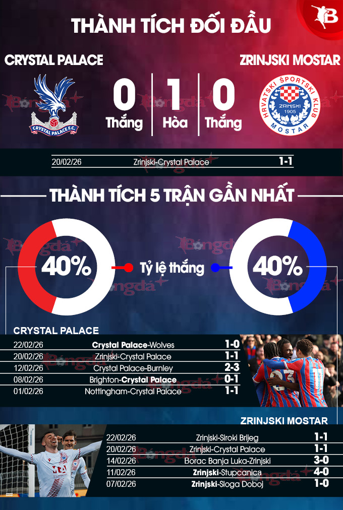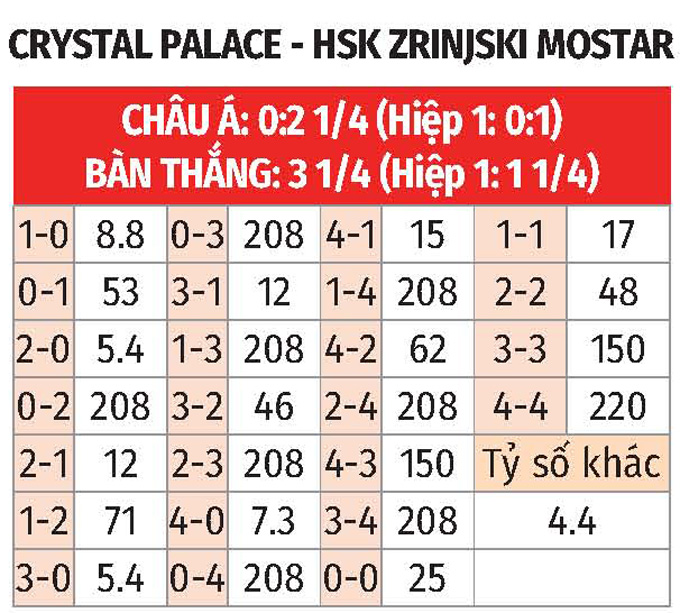- Hai đội cùng ghi bàn: Crystal Palace thành công trong việc ghi bàn ở 8/10 trận gần nhất, còn với Zrinjski là ở 9/10 trận vừa qua. Bên cạnh đó, Crystal Palace ghi bàn ở 6/9 trận vừa qua trên sân nhà, còn với Zrinjski là ở 7/10 trận sân khách gần đây. Với xu hướng như vậy, khả năng cao hai đội sẽ cùng tìm được đường vào khung thành của nhau.