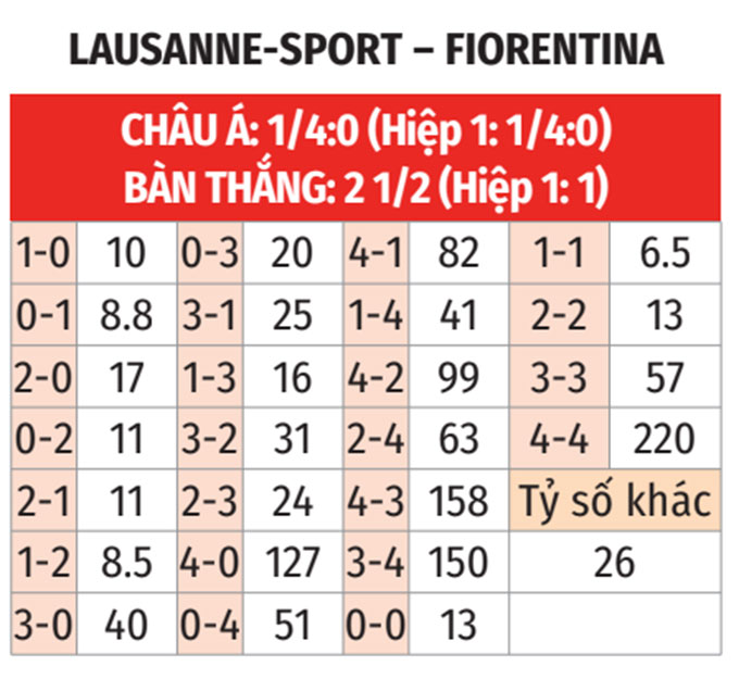 - Lausanne Sports thắng hiệp 1 theo châu Á: Trong 6 trận gần đây, Lausanne Sports thắng hiệp 1 theo châu Á tới 4 lần. Thực tế trên cộng với việc Fiorentina thua hiệp 1 theo châu Á ở 5/6 trận vừa qua là lý do các nhà đầu tư nên ủng hộ đội chủ nhà trước giờ nghỉ.