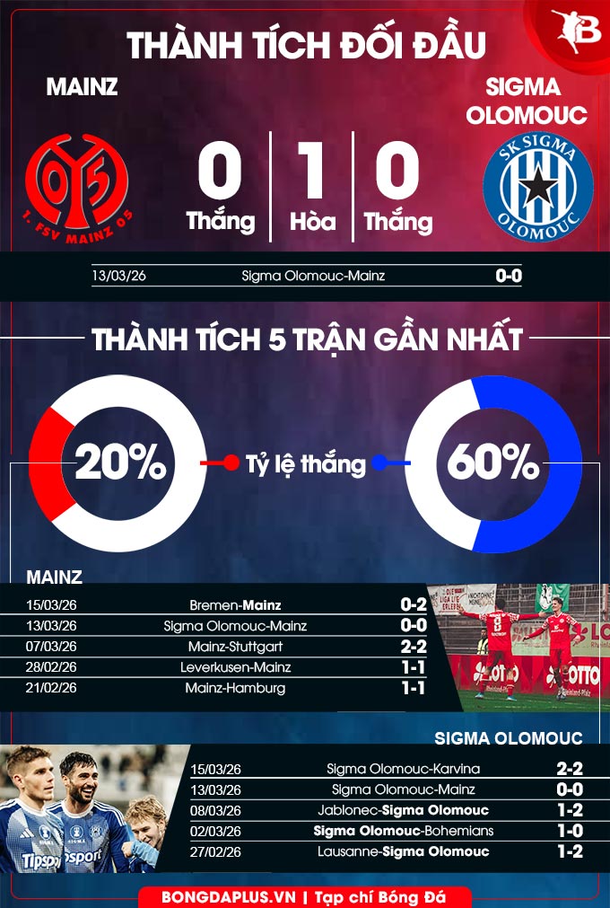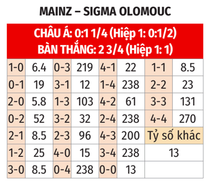 - 2 hoặc 3 bàn cả trận: 7/11 trận gần nhất của Mainz và 6/9 trận vừa qua của Sigma Olomouc đều khép lại với 2 hoặc 3 bàn cả trận. Hơn nữa, 3/4 chuyến làm khách gần nhất của Sigma Olomouc cũng có 2 hoặc 3 bàn cả trận. Xem ra, trận này khó có ngoại lệ.