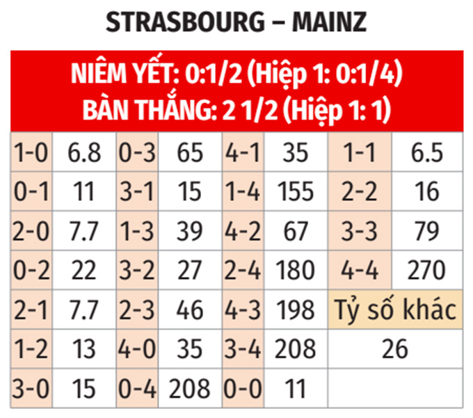 - Cuối hiệp 1 có bàn thắng: 4/5 trận gần nhất của Strasbourg và 3/4 trận gần đây của Mainz đều có ít nhất 1 bàn thắng từ phút 16-45 của hiệp 1. Ngoài ra, 9/11 trận sân nhà gần nhất của Strasbourg và 9/11 chuyến làm khách gần đây của Mainz cũng chứng kiến tối thiểu 1 bàn thắng ở 30 phút cuối hiệp 1.