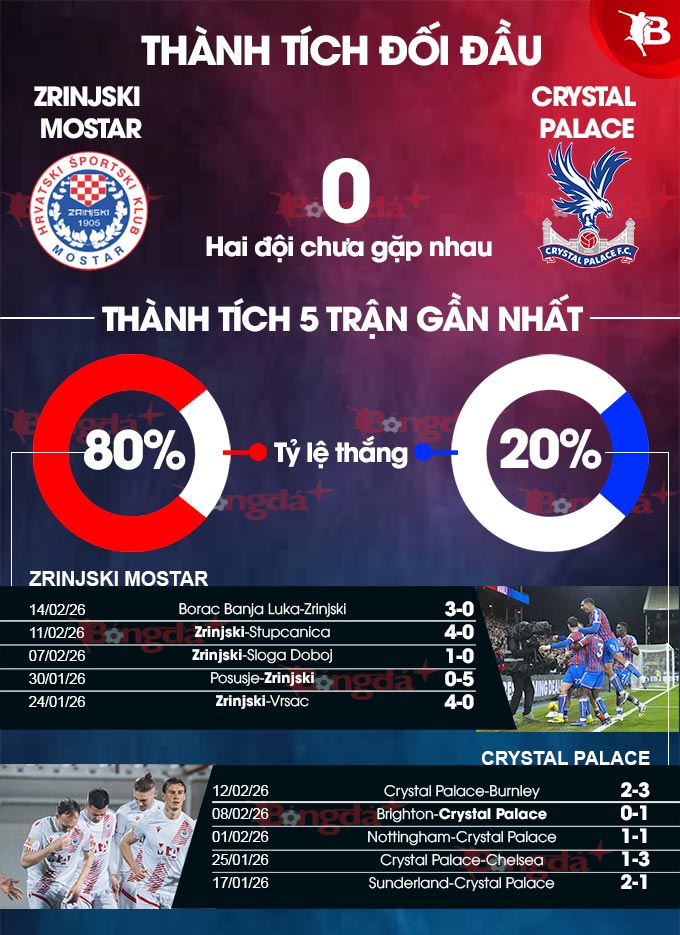 Cụ thể, Zrijnski thắng 6/10 trận gần nhất còn Palace chỉ thắng 1/10 trận vừa xong. Zrijnski có lợi thế sân nhà và đang chơi tốt tại đây khi có thành tích thắng 6/10 trận đã qua tại thánh địa pod Bijelim Brijegom.